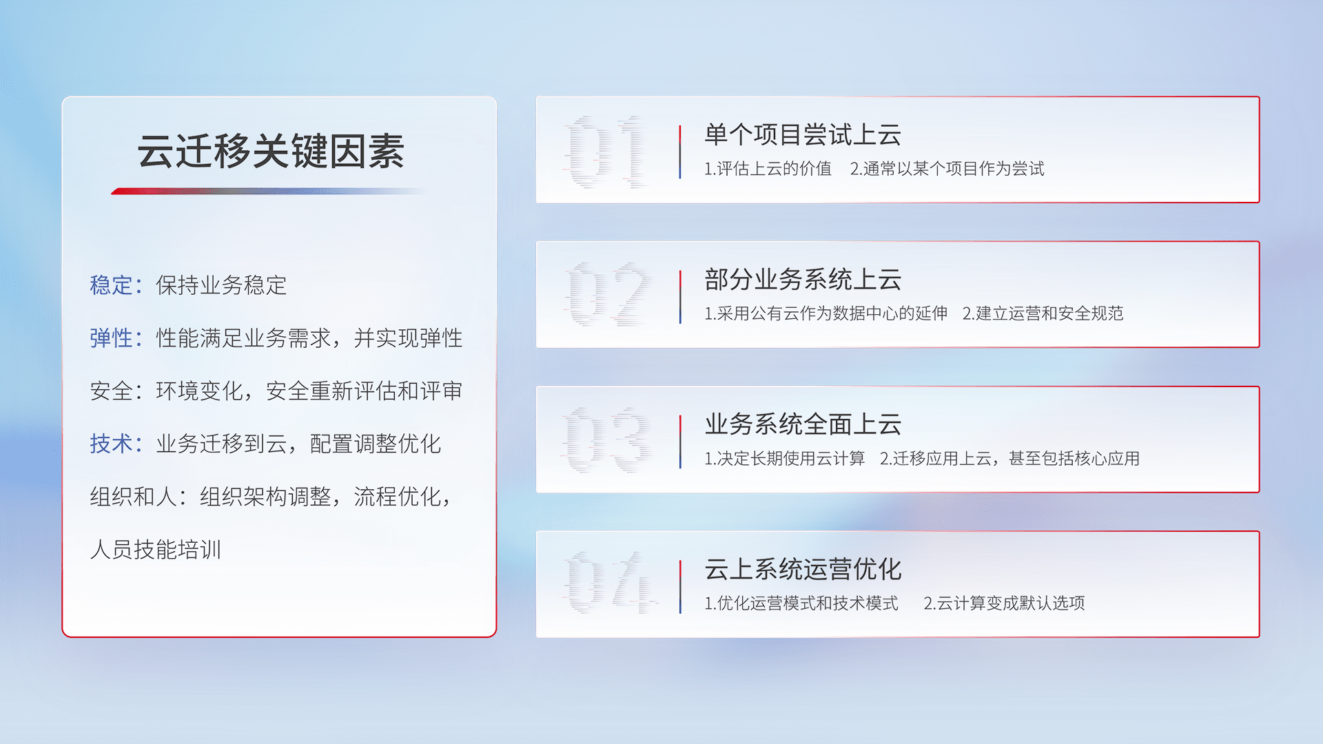 结合实际业务,,从规划设计、、云平台选型、、、云原生改造、、数据迁移、、、集成交付,,迁移全过程为客户识别最佳上云路径,,,做好风险识别管理,,设计网络架构、、身份权限、、、、安全审计合规、、、操作审计、、、、日志审计、、、监控告警策略、、、多站点容灾设计等,,对云上基础设施进行整体规划,,,提升IT治理水平,,,,以满足弹性、、、高可用、、、高性能的需求。。。。