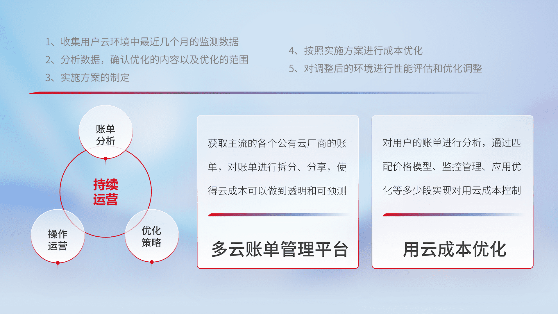 通过多云纳管,,,,以统一的资源数据模型把客户的云资源进行抽象和封装,,,进而实现对多云资源的统一操作,,保障云资源管理的可靠性、、、、稳定性与可用性。。量身定制化运维内容,,,,配置、、开发运维、、、补丁管理、、、备份、、、监控、、认证和访问管理、、、审计和日常巡检等,,,,保障在用云过程中的可靠度,,,,稳定度以及高可用率。。。